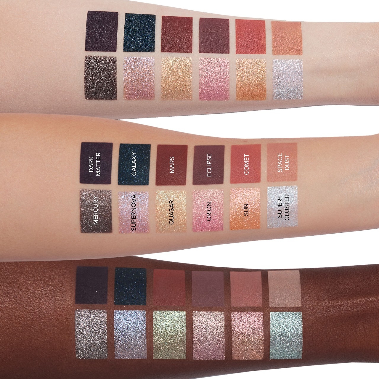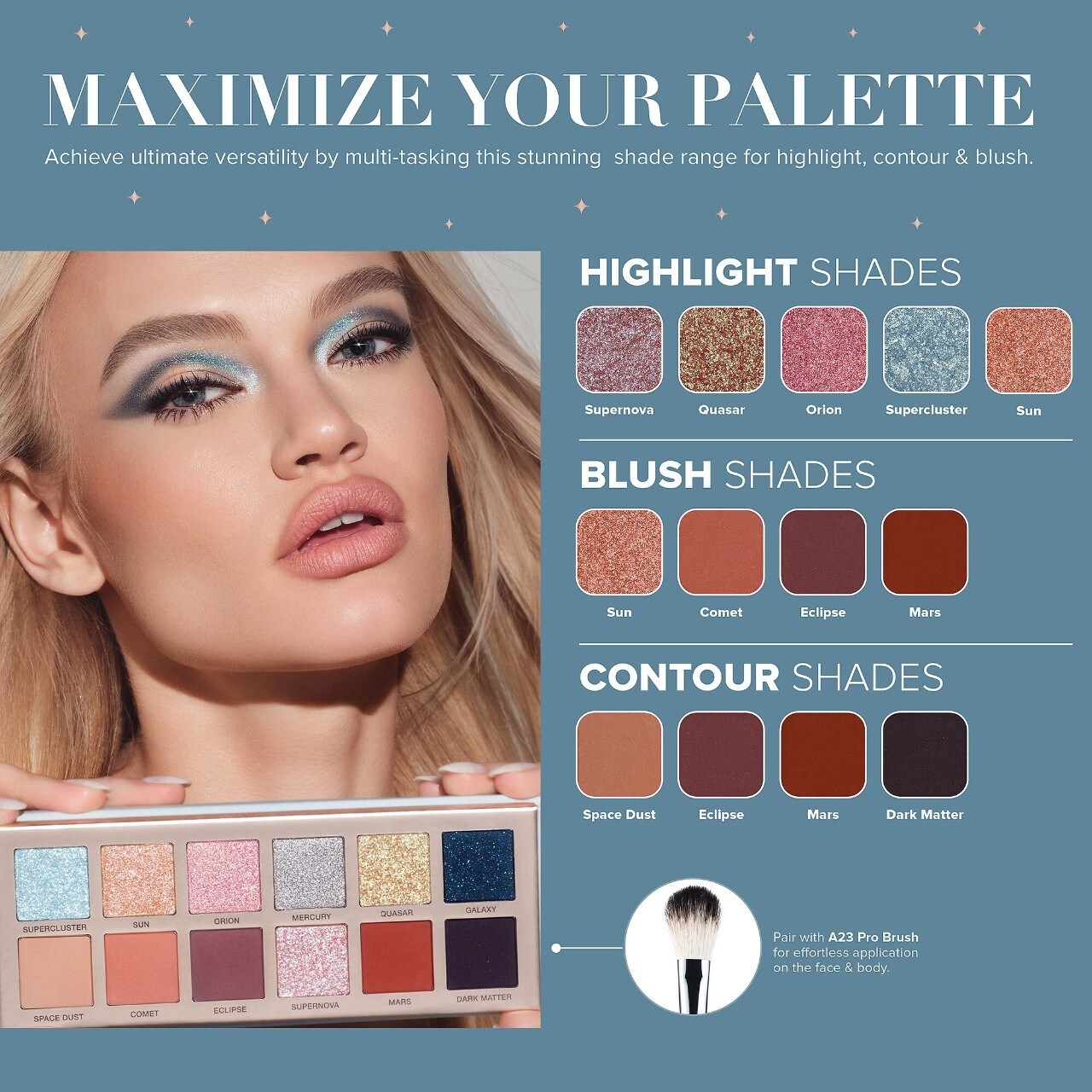 Ce este: Inspirata de explozia de culoare si lumina a universului, paleta Cosmos propune 12 nuante de pleoape cu pigment puternic, de la tonuri neutre la intense de la nisipiu, la turcoaz. Aceasta colectie de farduri mate, metalice si cu reflexii luminoase este potrivita pentru machiaje subtile, dar si dramatice, datorita formulelor usor de uniformizat si mixat.